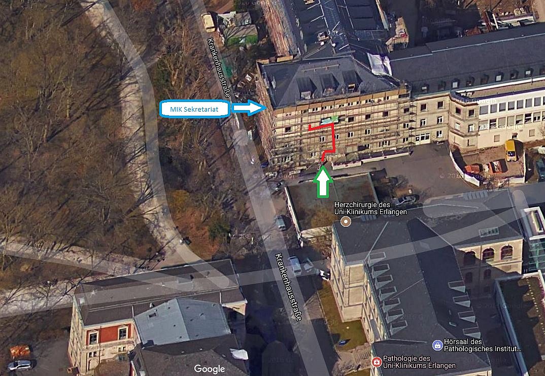 Betreten Sie das "Alte Universitätskrankenhaus" vom Eingang Krankenhausstraße 12 (grüner Pfeil). Halten Sie sich rechts und nehmen Sie den Aufzug ins 3. Obergeschoss. Alternativ können Sie auch die Treppe benutzen.